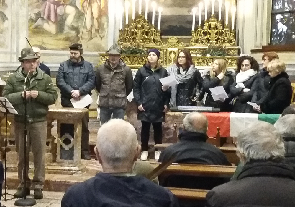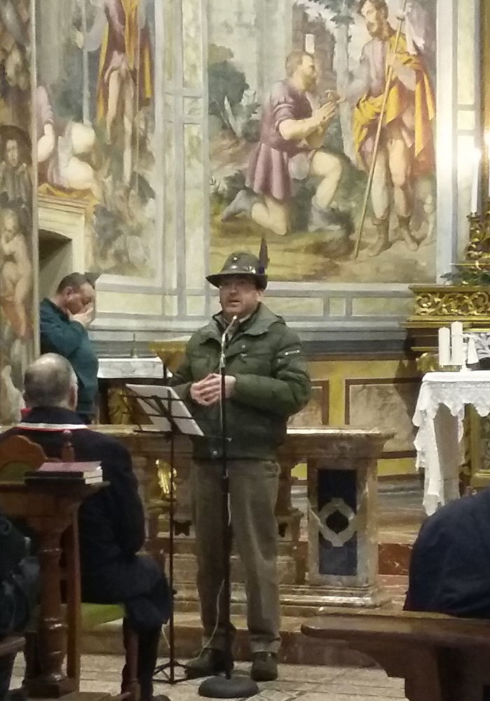 La messa è stata celebrata dal rettore don Tarenzi, condecorata dai canti del Gruppo “Voci senza tempo” Audacemente Ascendere, voluto e diretto dal maestro Giuseppe Scoglio, alpino in congedo, che da anni cura con tanto entusiasmo questa iniziativa della memoria, facendo proprio il motto dei Battaglioni “Bolzano e Trento” dell’aquila che imperterrita e fulminea punta verso l’alto, per invogliarci a tenere anche noi alto lo sguardo per le cose belle della vita. E la bravura del Gruppo corale ci ha donato canti, davvero densi di emozioni e ricchi di riflessioni sugli eventi passati, quali : “L’ultima notte degli alpini” , “Mira il tuo popolo”, “Signore delle cime”.